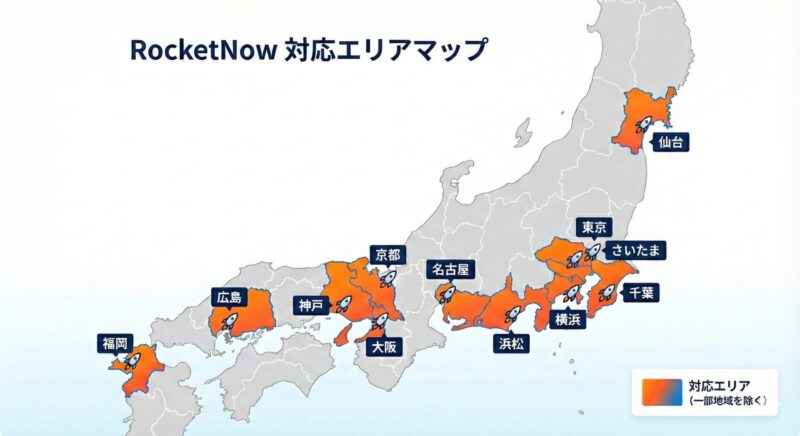 ロケットナウの配達エリアは2025年11月現在、宮城、東京・神奈川・千葉・埼玉、静岡、愛知、大阪、兵庫、京都、広島、福岡の主要都市をカバーし、今後も着実な拡大が予想されます。